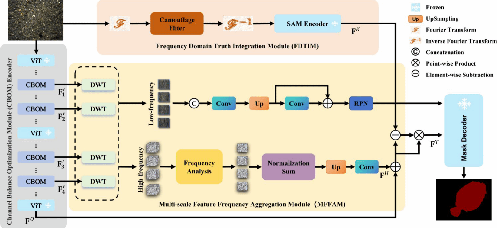 2. 提出一种面向水下伪装实例分割任务的UCIS-SAM模型,从颜色失真校正、频域干扰抑制与多频特征融合三个关键方面构建统一建模框架,通过通道优化(Channel Balance Optimization Module, CBOM)、频域真值集成(Frequency Domain Truth Integration Module, FDTIM)以及多尺度特征频域聚合(Multi-scale Feature Frequency Aggregation Module, MFFAM)的协同设计,有效提升水下伪装目标的判别能力与边界表达能力,从而显著提高分割精度。
